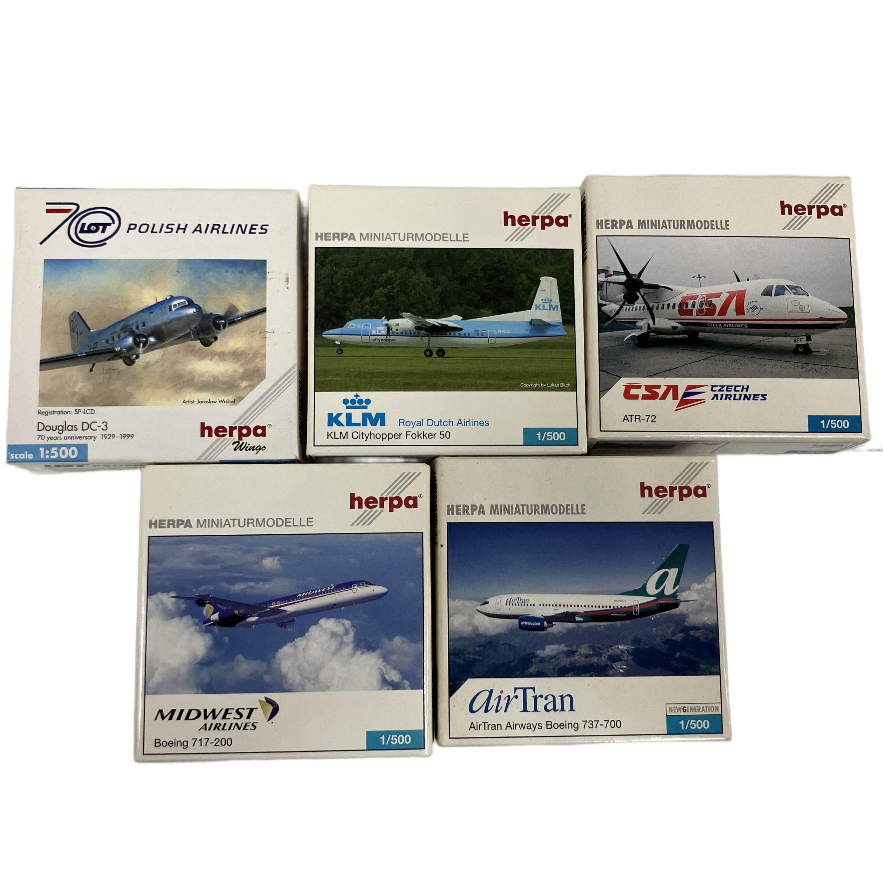 herpa Fokker50/DC-3/ATR-72/717-200/737-700 飛行機模型 ヘルパ フィギュア 5点セット 1/500 中古
