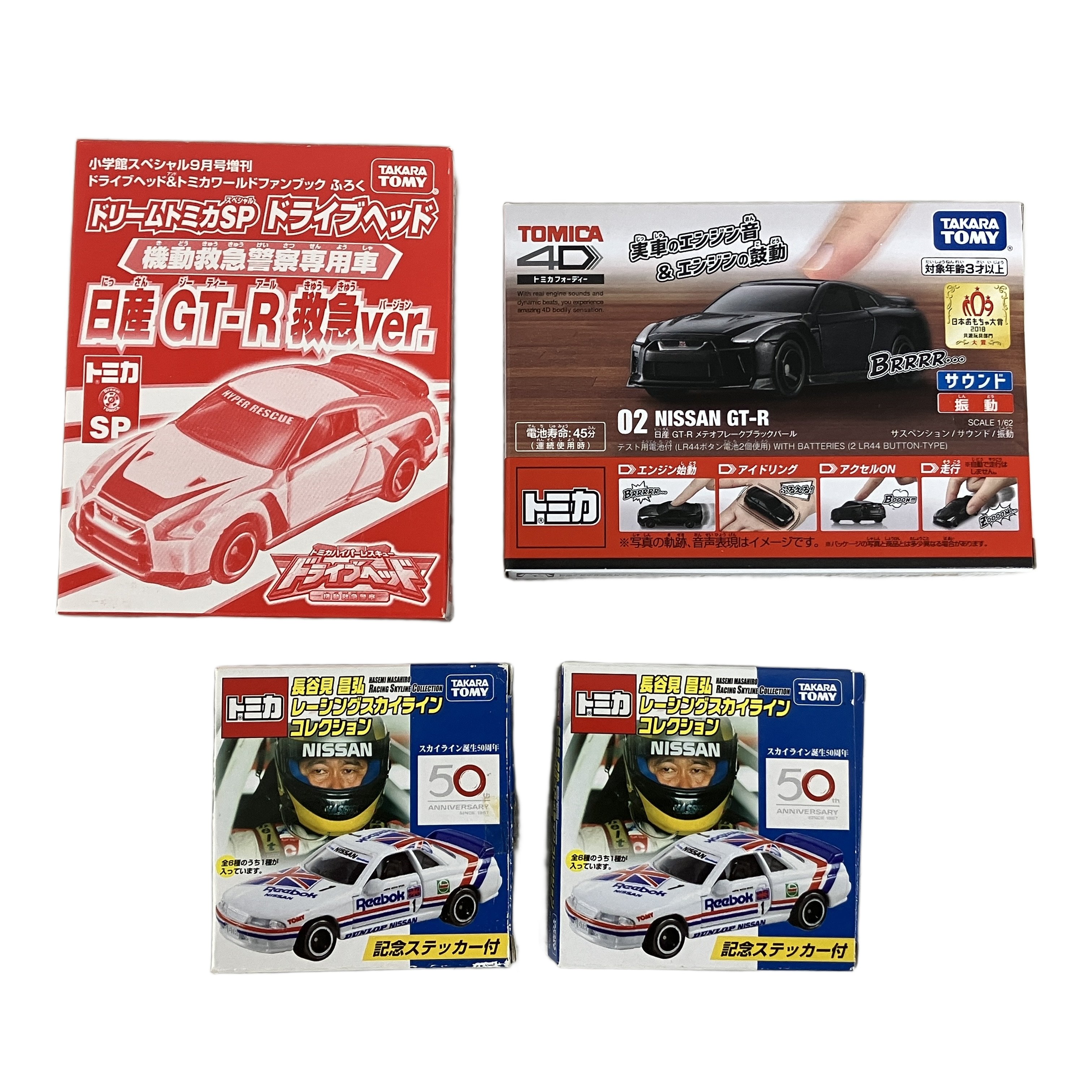 タカラトミー トミカ4D 02 日産 NISSAN GT-R メテオフレークブラックパール ミカ 長谷見昌弘 レーシングスカイラインコレクション リーボック スカイライン R31 4点おまとめセット 中古