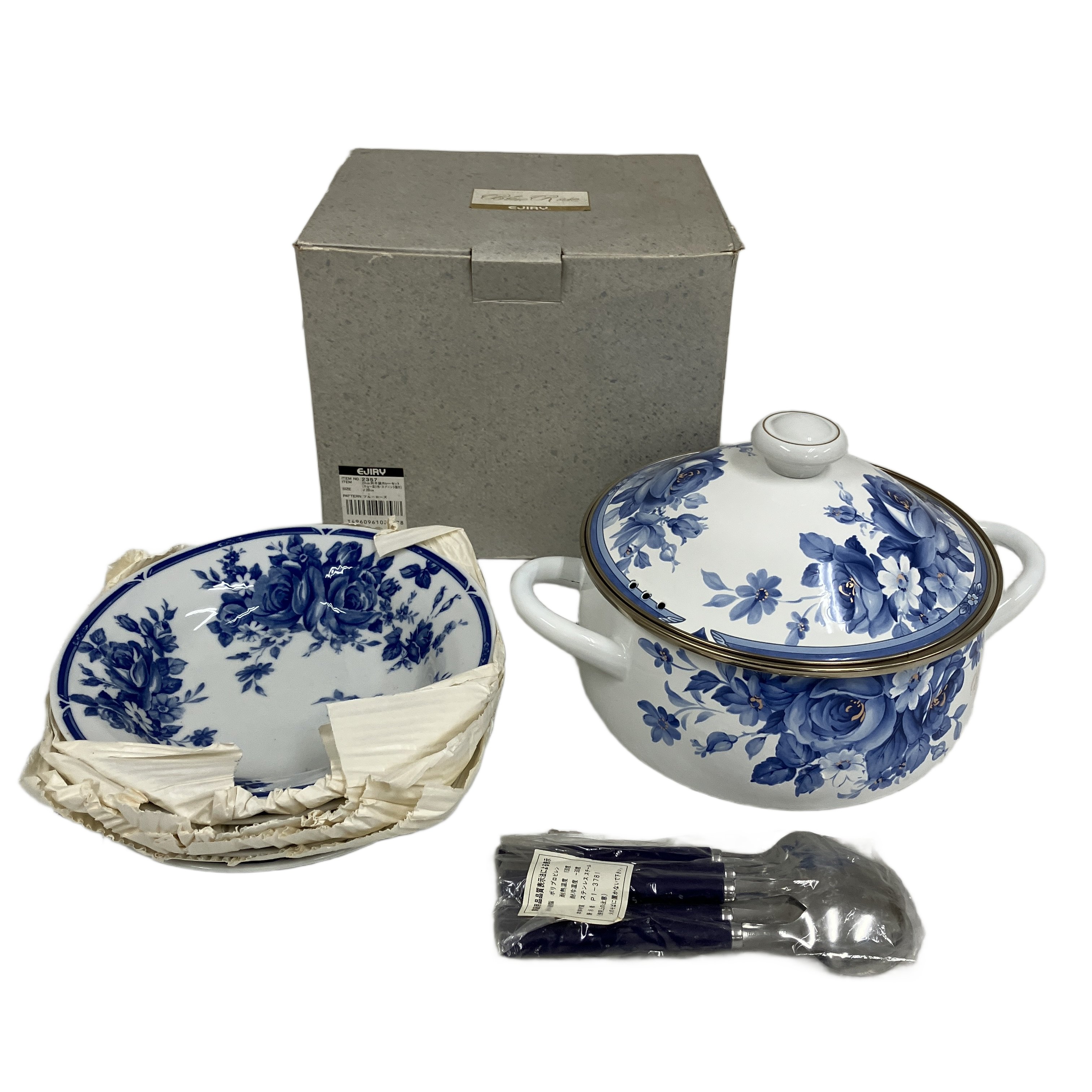 EJIRY 2357 ブルーローズ 20cm 両手鍋 カレー皿 スプーン 5組 セット ホーロー エジリー 中古